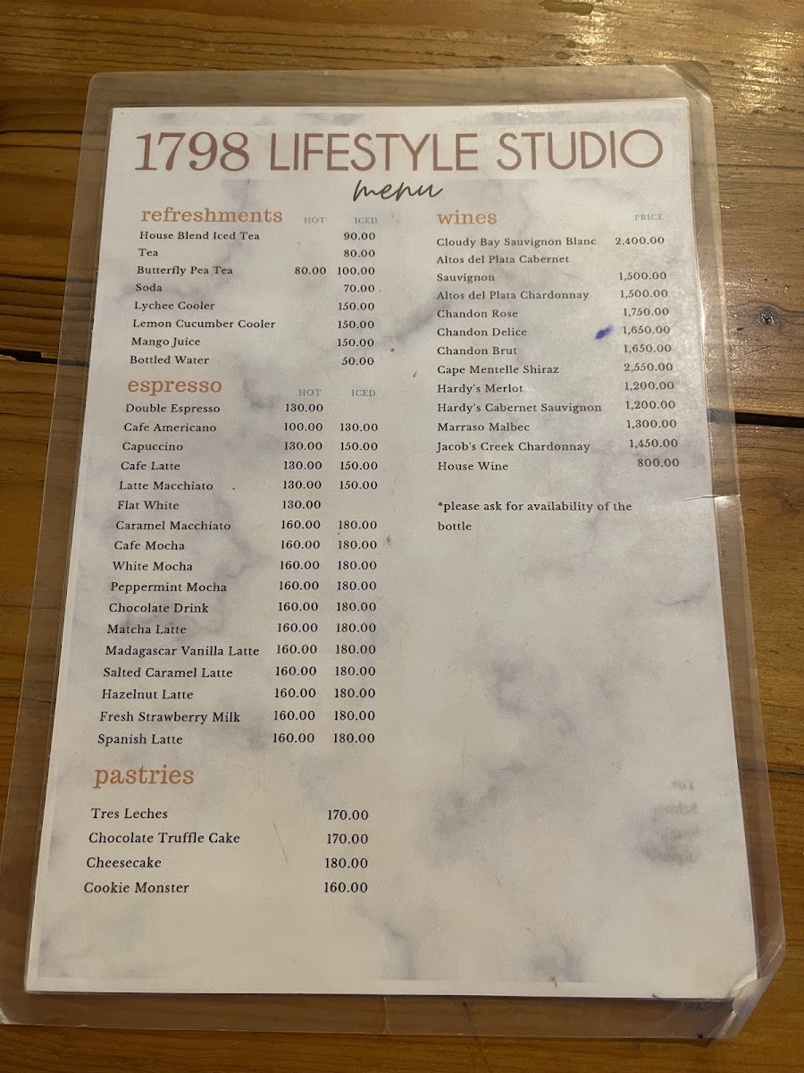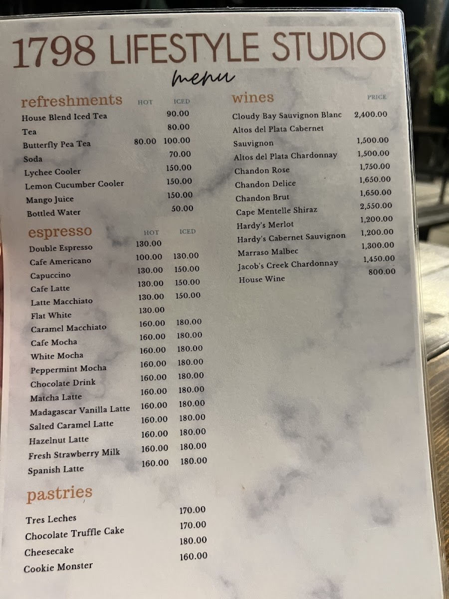 1798 Lifestyle Studio Menu